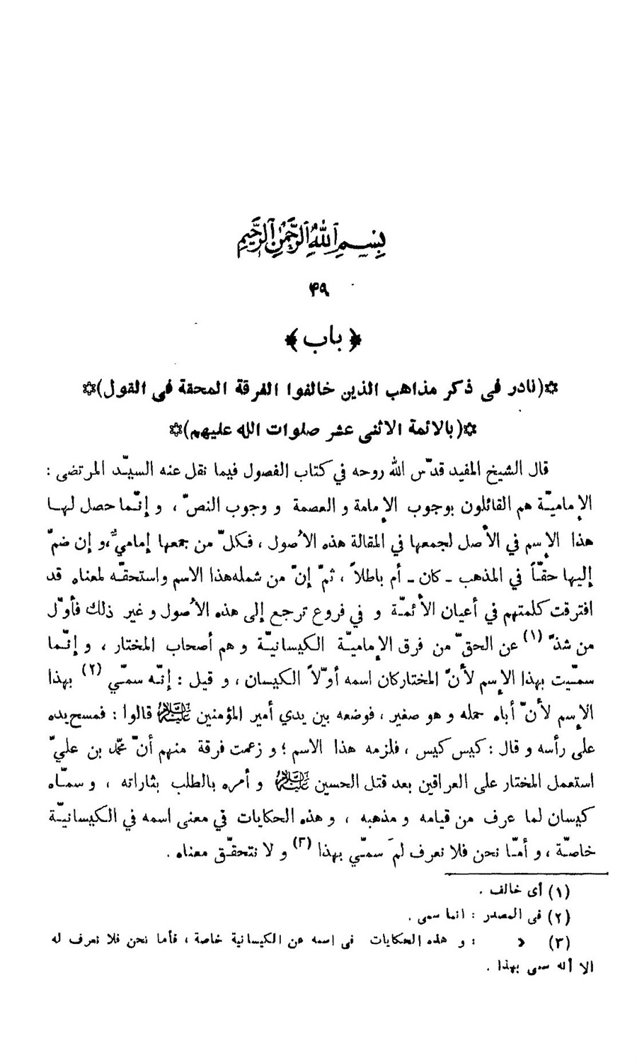 قال الشيخ المفيد قدس الله روحه في كتاب الفصول فيما نقل عنه السيد المرتضي الإمامية هم القائلون بوجوب الإمامة و العصمة و وجوب النص و إنما حصل لها هذا الاسم في الأصل لجمعها في المقالة هذه الأصول فكل من جمعها إمامي و إن ضم إليها حقا في المذهب كان أم باطلا ثم إن من شمله هذا الاسم و استحقه لمعناه قد افترقت كلمتهم في أعيان الأئمة و في فروع ترجع إلي هذه الأصول و غير ذلك فأول من شذ(1) عن الحق من فرق الإمامية الكيسانية و هم أصحاب المختار و إنما سميت بهذا الاسم لأن المختار كان اسمه أولا الكيسان و قيل إنه سمي (2) بهذا الاسم لأن أباه حمله و هو صغير فوضعه بين يدي أمير المؤمنين عليه السلام قالوا فمسح يده علي رأسه و قال كيس كيس فلزمه هذا الاسم و زعمت فرقة منهم أن محمد بن علي استعمل المختار علي العراقين بعد قتل الحسين عليه السلام و أمره بالطلب بثاراته و سماه كيسان لما عرف من قيامه و مذهبه و هذه الحكايات في معني اسمه في الكيسانية خاصة و أما نحن فلا نعرف لم سمي بهذا(3) و لا نتحقق معناه.