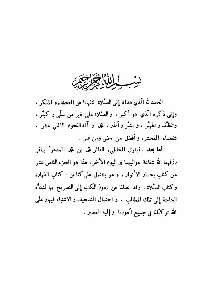 أما بعد، فيقول الخاطئ العاثر محمد بن محمد المدعو بباقر رزقهما الله شفاعة مواليهما في اليوم الآخر، هذا هو الجزء الثامن عشر من كتاب بحار الأنوار، وهو يشتمل علي كتابين: كتاب الطهارة وكتاب الصلاة، وقد عدلنا عن رموز الكتب إلي التصريح بها لشدة الحاجة إلي تلك المطالب، واحتمال التصحيف والاشتباه فيها وعلي الله توكلنا في جميع أمورنا وإليه المصير.